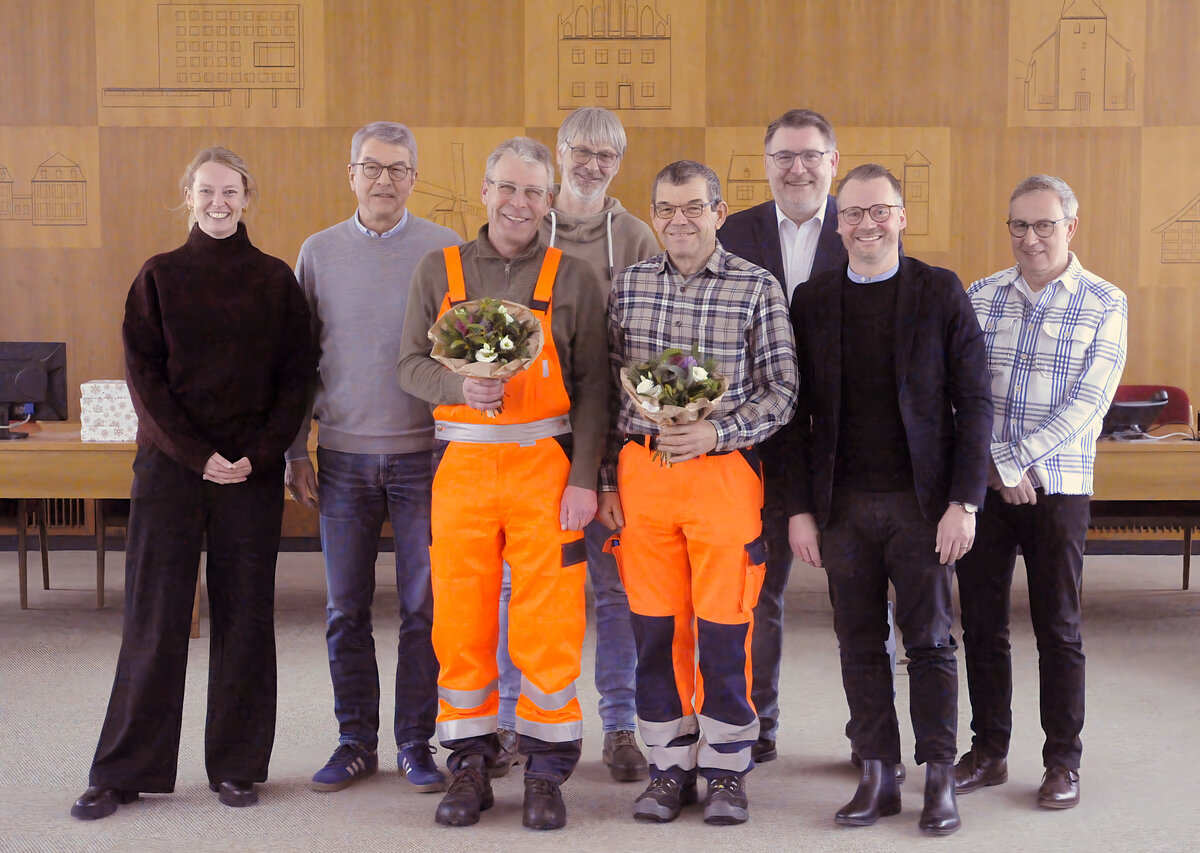 Bürgermeister Philipp Knappmeyer ehrte die Jubilare im Rahmen einer kleinen Feierstunde im Beisein von Baudezernent Ingo Ellerkamp, dem Leiter der Kläranlage Jürgen Baue, Tiefbauamtsleiter Ulrich Brune, Hauptamtsleiter Roland Kelle und Personalrätin Jasmin Detering, für ihre langjährige treue Pflichterfüllung.